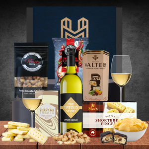 Delightful Pinot Grigio This gift features a bottle of Chardonnay from The Untold Story, delicious Walter's Nougat, Mac's Shortbread and sweet chilli chips, this is a perfect gift for someone special....