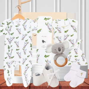 The Baby Koala Christening Gift Hamper is presented in a premium gift box that is packed with stylish tissue paper and finished with a decorative "God Bless You" sleeve. All our hampers come with a free "God Bless You" gift card, printed with your personalised message, or you can pick one from our extras.