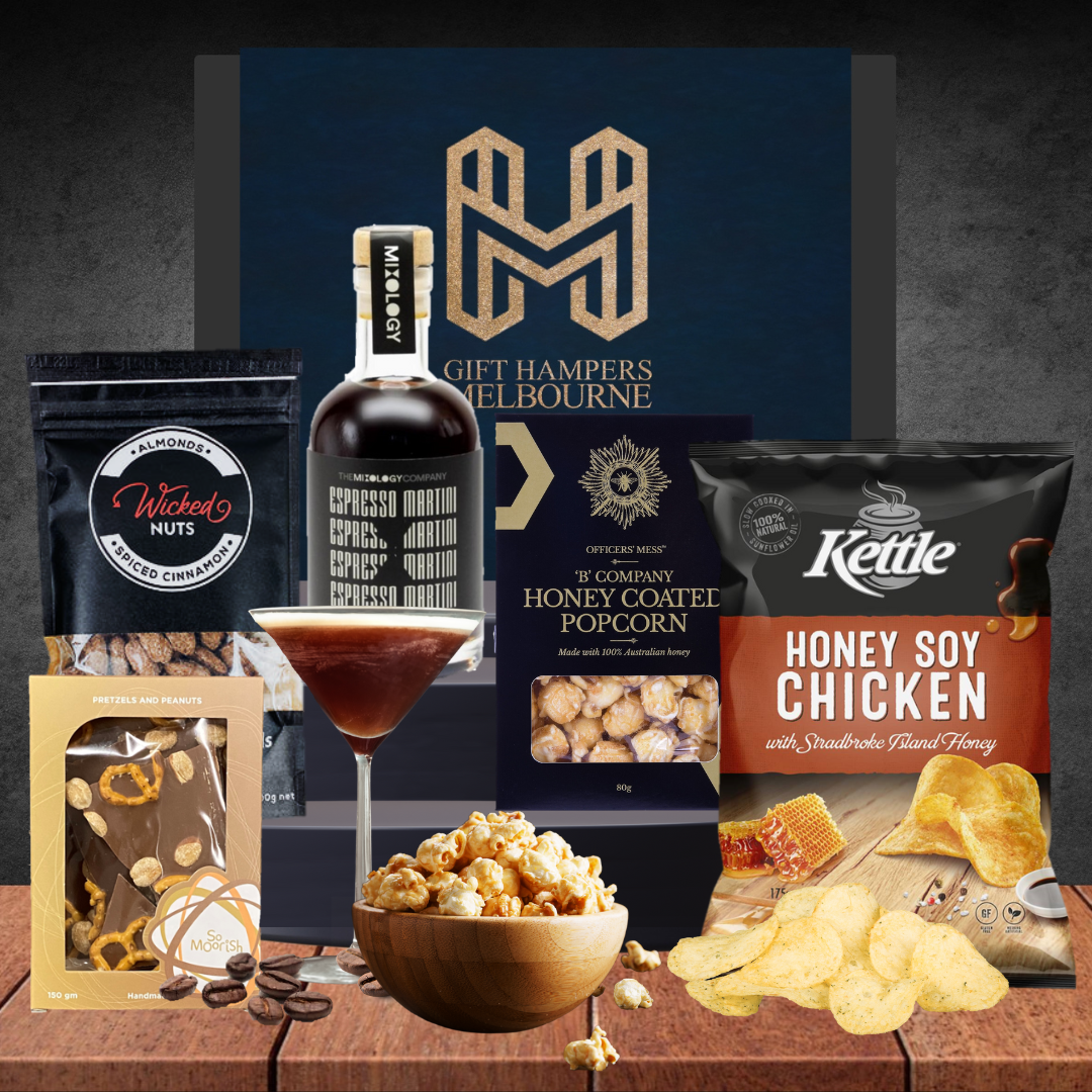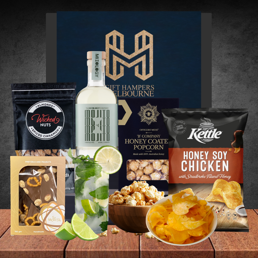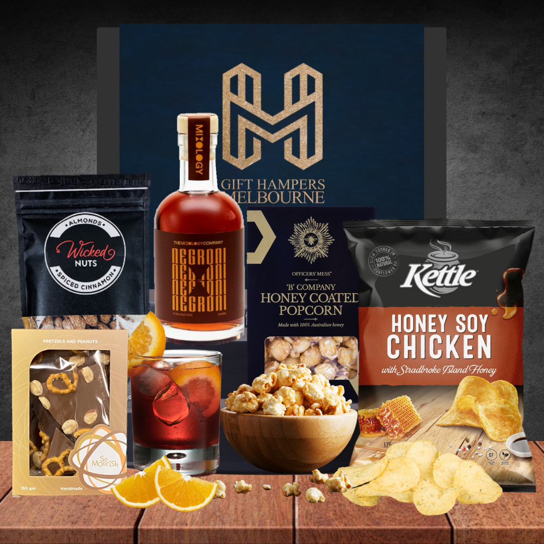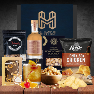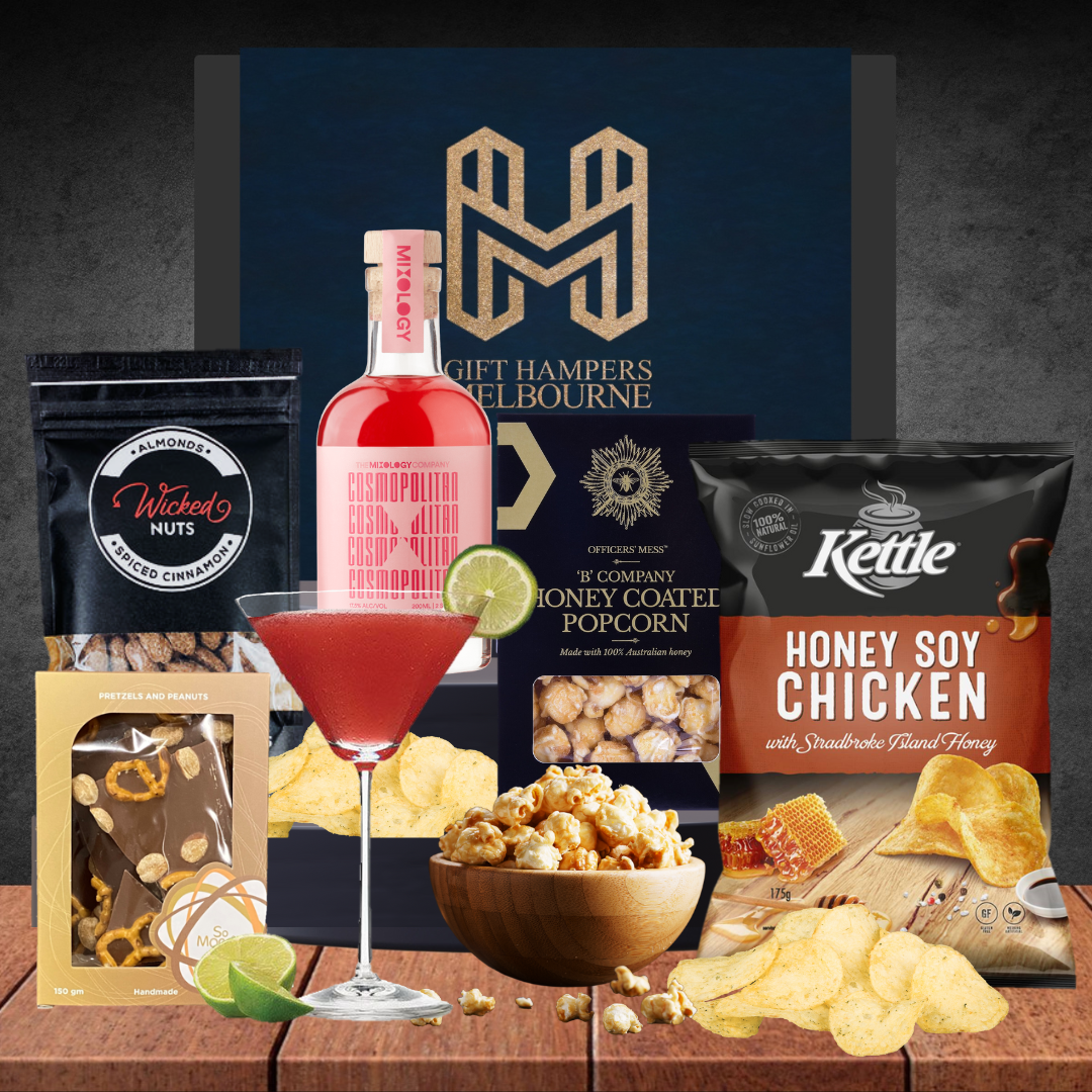 Cocktail Choice! This gift comes with a selection of snacks and your choice of cocktail blend, from a classic Old Fashioned, the coffee lover's Espresso Martini, a citrusy Margarita, sweet Negroni, Amaretto sour, classic Mojito or frothy Cosmo. Oh what fun your friends and family will have with this Cocktail hamper.