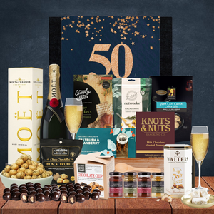 This is a Gourmet Gift Hamper to envy that has all the delicious trimmings with Moët Champagne, black truffle risotto, Belgian chocolate and more! It's decadent, divine and delicious. Perfect for a 50th Birthday Celebration, or any birthday gift that deserves a little luxury.
