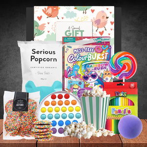 Spread the love and kindness with this kids hamper. With a bright colouring book, rainbow popit, bouncy ball and snacks, it's a celebration they'll enjoy.