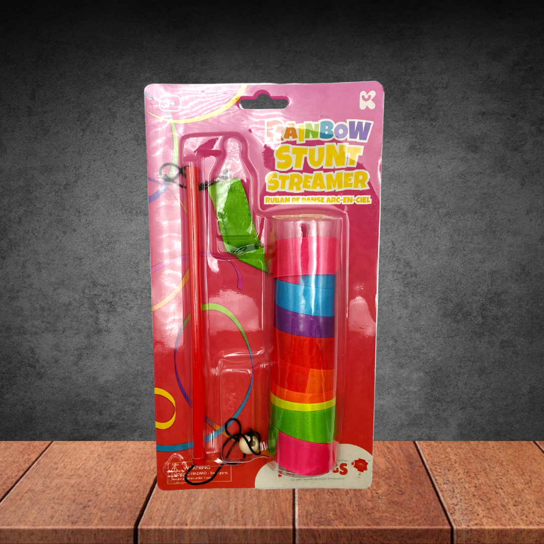 Colourful rainbow stunt streamer designed for fun outdoor play and tricks.