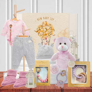 Is there a precious Baby Birthday to celebrate? Delight the proud parents with our Baby Girl's 1st Birthday Hamper, the perfect choice for treating their little one. This charming hamper includes a cuddly teddy and a stylish three-piece baby gift set available in soft pink or gentle nude. It's a heartwarming gift that any new parents would absolutely adore.