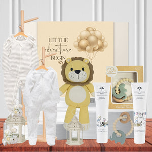 The Baby Snuggles with Leo Lion proves to be an impeccable choice for a baby shower or a welcoming gesture to the world. This charming baby hamper is an ideal gift, designed to delight both the parents and the baby. It boasts a collection of beautiful baby essentials, including a lovable knitted toy, two gentle onesies, and a soothing teether. A truly remarkable present for the new arrival that will undoubtedly capture the hearts of the new parents.