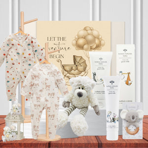 Welcome the arrival of the little bundle of joy with our range of wonderful baby hampers. Our snuggly new baby gift features a plush teddy, soft baby growsuit and more. It's so cute!