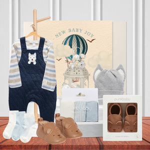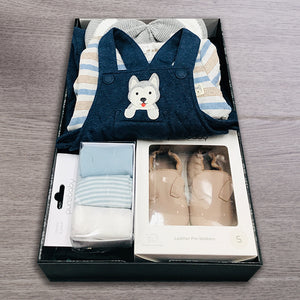 An exquisite present for the charming young gentleman, our Blue Bundle & Baby Shoes Hamper is a striking assortment brimming with delightful baby essentials. The hamper features a charmingly quilted Husky-themed overall, a striped bodysuit, a coordinating Husky hat, along with socks and the most endearing baby shoes. This incredibly cute baby gift is destined to capture the hearts of new parents.