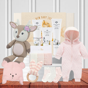 Welcome the arrival of the little bundle of joy with our wonderful baby hampers. Our snuggly new baby gift features a plush teddy, soft baby growsuit, cute baby beanie, baby bath time essentials and more. It's so cute!