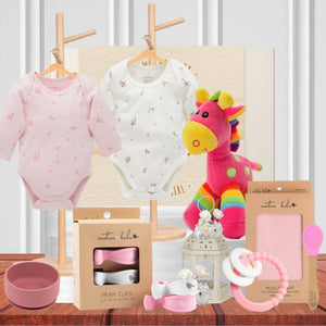 A new baby is the perfect reason to celebrate! Send a bright, happy gift to welcome them to the world and congratulate the new parents with our range of beautiful, colourful baby hampers. Our wonderful baby hampers make for a delightful baby gift with a colourful Giraffe toy, warm socks, teether and more.