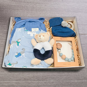 Is there a new little baby boy with to welcome into the world? Send the new bundle and parents our New Little Man Baby Hamper. This delightful baby hamper makes the perfect gift of gorgeous baby items including a bodysuit and lounge pants, a cute bear hat, booties and a teether. Such a cute new baby gift the new parents will love.