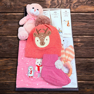 Welcome the arrival of the little bundle of joy with our Snuggles Baby Girl gifts range of wonderful baby hampers. Our snuggly new baby gift features a plush teddy, soft baby growsuit, cute baby beanie, baby bath time essentials and more. It's so cute!