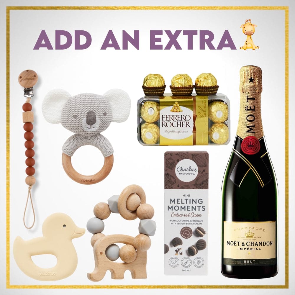 This hamper is presented in a premium gift box which is packed with stylish tissue paper and finished with a special Baby inspired decorative sleeve, and all our hampers come with a free "For You" gift card, printed with your personalised message.