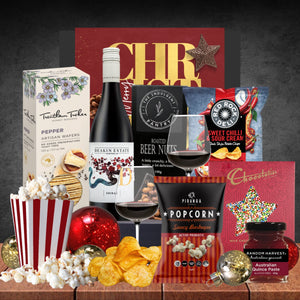 Celebrate the season with this festive treat designed to tantalize your taste buds. This charming Christmas hamper features a exquisite bottle of Shiraz paired with an assortment of delightful snacks. A perfectly-sized holiday gift with a touch of elegance and a selection of tasty bites, this gift box is a wonderful way to indulge and enjoy the festivities.