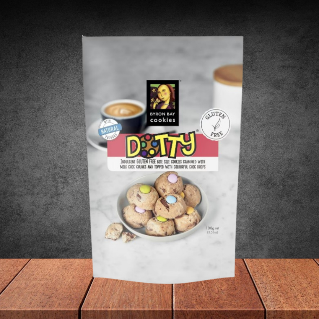 Byron Bay Dotty Gluten Free Cookie Bites are expertly crafted in Byron Bay using a heritage cafe recipe from the Byron Bay Cookie Company. These bite-sized treats are packed with rich milk chocolate chunks and adorned with vibrant chocolate drops. Proudly Australian owned and baked, they offer a perfect gluten-free indulgence that captures the authentic flavors of Byron Bay in every mouthful. Ideal for discerning cookie enthusiasts seeking a delicious, gluten-free option.