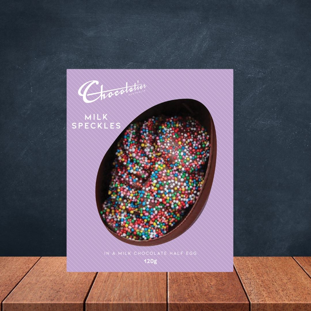 This extra thick milk chocolate half egg filled with crunchy speckle discs makes a wonderful Easter gift.