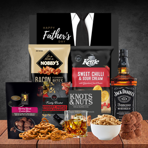 Savour a relishing bottle of Jack Daniel's Old No.7 Tennessee Whiskey and talk of the old times you shared with your dad. Savour this American Whiskey with scrumptious snacks from famous Aussie brands such as Knots & Nuts and Byron Bay. Enjoy a handful of your favourites with Dad such as Baked Pretzel and Bacon Bites!