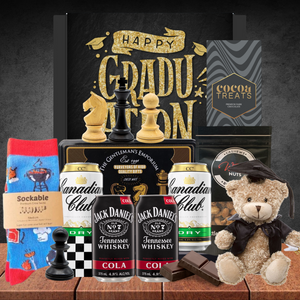 It is nice to be a part of someone's life achievements. You can be a supportive role model to the newly graduated student in your family. This graduation hamper is a perfect gift that you need to surprise them. This hamper features a selection of important elements such as The Gentleman's Emporium chess set, Jack Daniels Tennessee whiskey & cola, Canadian Club whisky & dry, socks and more!