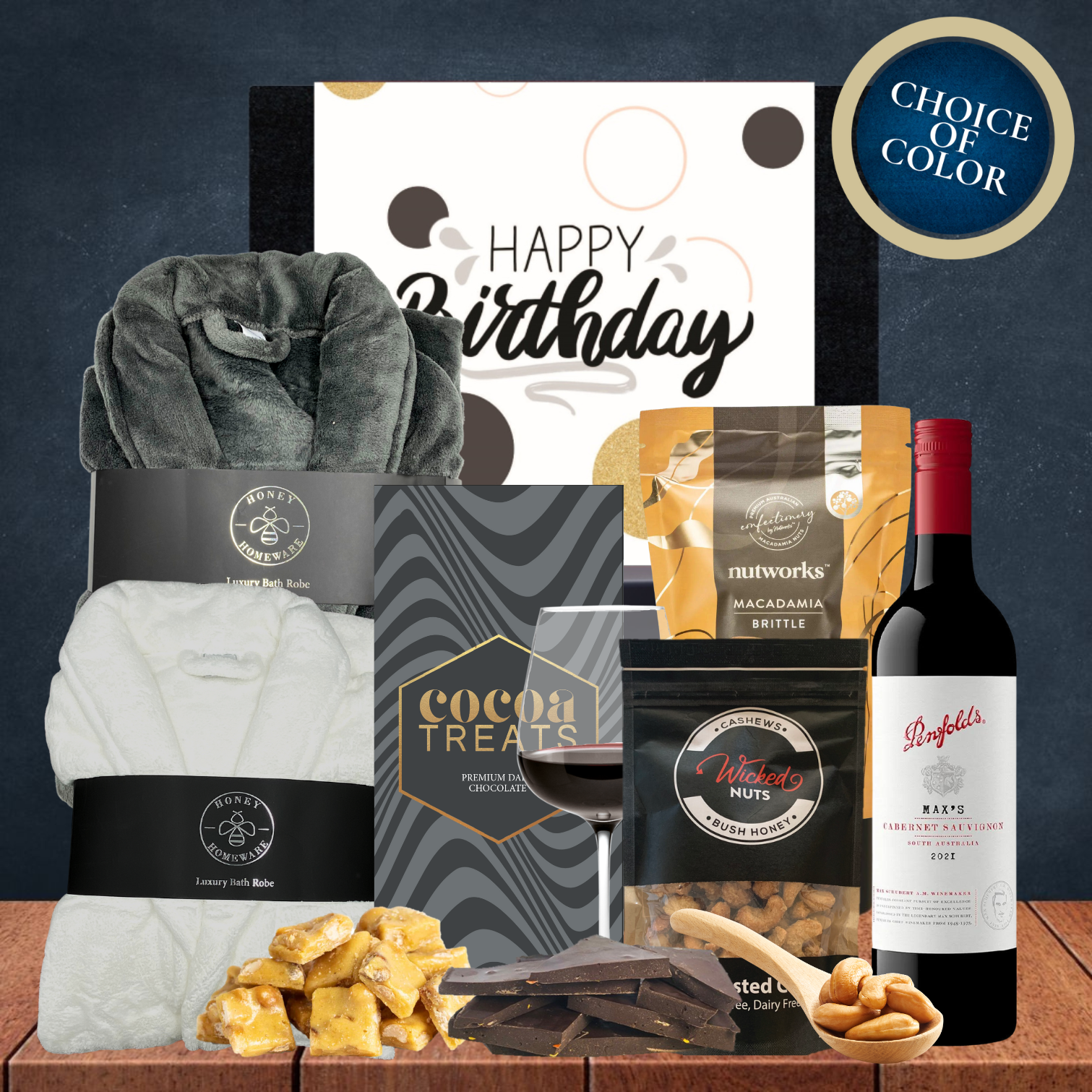 Let Him Feel Royal This Birthday!! Your recipient deserves to be in their favourite luxe bathrobe all day long! This stunning birthday basket features a bottle of Penfolds Max's Cabernet Sauvignon...