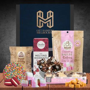 Indulge in the powers of pink with this delightful hamper filled with scrumptious goodies and pink assorted snacks. Your beloved recipient is going to adore this handcrafted handpicked assortment of mesmerising Australian products made to impress their hearts! We feature Coconut Ice Cubes, Raspberries & Cream Fudge, Mini Melting Moments, Pink Rocky Road and Freckleberry Freckle to devour! How cool can this hamper get?