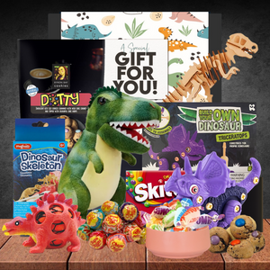 A little dino reptilian play. This kids hamper will keep the dinophile's at play, whether they're a future palaeontologist or just love a good roar. Squish the guts out of a dino, build a 3D dinosaur and munch on some treats. It's roar-some!