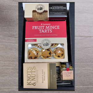 A foodie feast, perfect for summer picnics. This gift comes with a cheeseboard and knife set, antipasto delights, crackers and traditional fruit mince tarts. Such a festive delight. Happy Christmas!