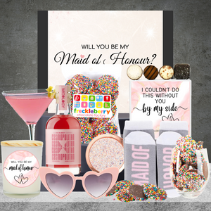 Send your future Maid of Honour a cocktail and entice them to stand by your side in celebration. This fun gift features a Cosmo cocktail, socks, sunnies plus more. The perfect Maid of Honour gift.