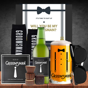 Send your Groomsmen a gift they'll remember and remind him the drinks are on you if he says YES. This Groomsman gift comes with an Australian-style lager and beer stein, socks, sunnies and delicious chocolate.