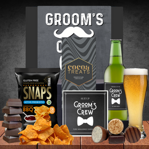 This special treat box gift hamper is presented in a petite gift box which is packed with stylish tissue paper and finished with a Groom's Crew decorative sleeve, and a free "For You" gift card, printed with your personalised message.