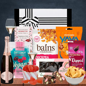 Send some extra love to your special someone with a vegan hamper. This delightful vegan hamper is specific to its diet. Featuring a beautiful bottle of sparkling rose your beloved recipient can experience scrumptious treats such as dark chocolates, Rocky Road, Chilli & Lime chickpeas chips and so much more. This hamper is ideal to gift away to your special lady or to simply devour together!