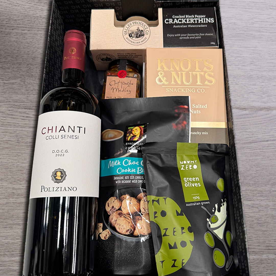 Dark Italian Red Send a wonderful thank you gift to someone special. Italy's Poliziano Chianti Colli Senesi Docg 2022 with some sweet and savoury delights make this gift one to be...