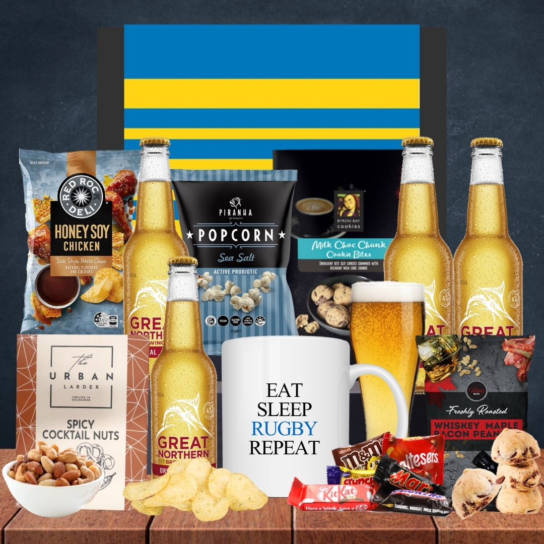 This sporty NRL hamper is packed into a premium gift box, in between stylish tissue paper and finished with a decorative sleeve. You can also leave your thoughtful messages on our free greeting cards that we have for you with each NRL Hamper. Explore all the products today!