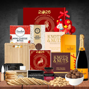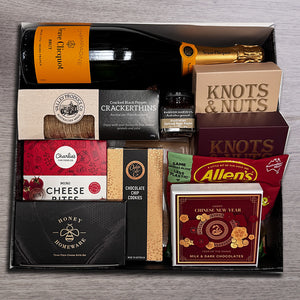 The perfect gift for your Chinese New Year celebrations! This stunning hamper is filled with all the delectable Aussie ingredients to savour with your loved ones all day long. Featuring a bottle of Veuve Clicquot Brut Yellow Label Champagne and a handful of scrumptious snacks, you can have the perfect touch to your Chinese New Year! Enjoy some nibbles from mini cheese bites, salted nuts and crackers with quince. Just add cheese and enjoy a glass of Veuve. Perfect for any celebration!
