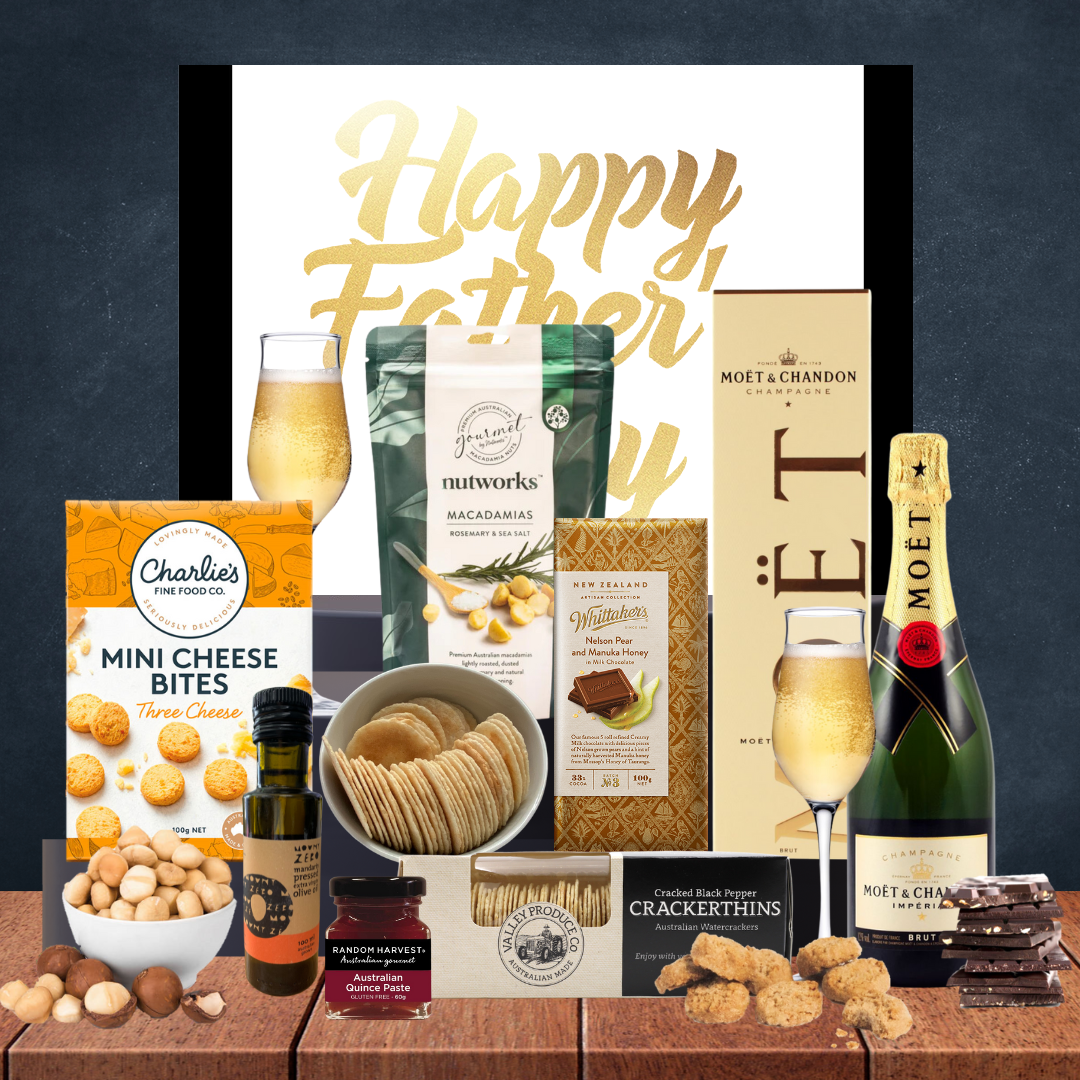 Give your golden dad the golden touch of love this Father’s Day. The Moet Brut Impérial Champagne bottle reflects its subtle pear, citrus and brioche notes with each sip. With all the favourite Aussie snacks such as Charlie’s Fine Foods Mini Cheese Bites Three Cheese or Gourmet By Nutworks Macadamias Rosemary & Sea Salt, your dad is surely up for a treat!