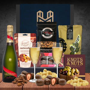 Pop the cork and celebrate in style! This gourmet hamper is brimming with sweet delights, like chocolate-coated strawberries and savoury treats, such as delicious salted chilli macadamias. All perfectly paired with a bottle of bubbly G.H. Mumm. Enjoy the ultimate indulgence!