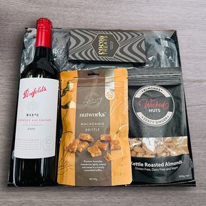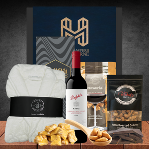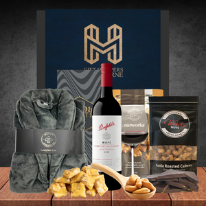 Bless your recipient with a round of wine in a robe, all day long! This beautiful hamper features a bottle of Penfolds Max's Cabernet Sauvignon and a Honey Homeware Luxury Bath robe, giving your giftee the plushest dreams they could ever imagine. Watch them munch on the crunchiest bush honey cashews craft nuts while devouring a slab of Belgian dark chocolate!