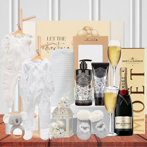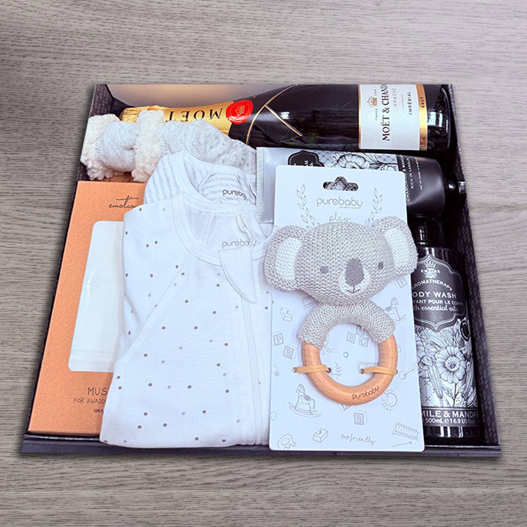 A celebratory gift for the new baby and parents. Welcome the arrival of the little bundle of joy with our Celebrating the New Baby Hamper. Our inclusive new baby gift features a bottle of Moët, handmade rattle, soft baby growsuits and more. It's time to toast the new family!
