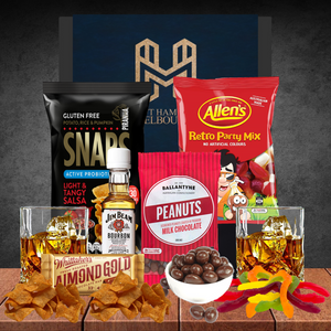 Don't miss this gift. For all bourbon lovers, this treat box featuring Jim Beam, chocolate and chips is a true delight for any occasion. This treat box has a sneaky little bottle of wine along with some yummy treats, making it a little gift for any occasion. This treatalicious gift is a perfect little snack with a sneaky touch of alcohol that all the adults will enjoy, no matter the occasion.
