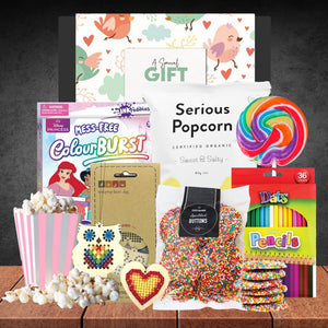 Puzzles, pencils, pendants and popcorn. This girls hamper is for the colourful, creative kids to enjoy. With some colouring, creating and some delicious snacks, it's a princesses celebrations complete.