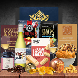 Celebrate the season with this festive treat designed to tantalise your taste buds. This charming Christmas hamper features a exquisite bottle of Chardonnay paired with an assortment of delightful snacks. A perfectly-sized holiday gift with a touch of elegance and a selection of tasty bites, this gift box is a wonderful way to indulge and enjoy the festivities.