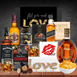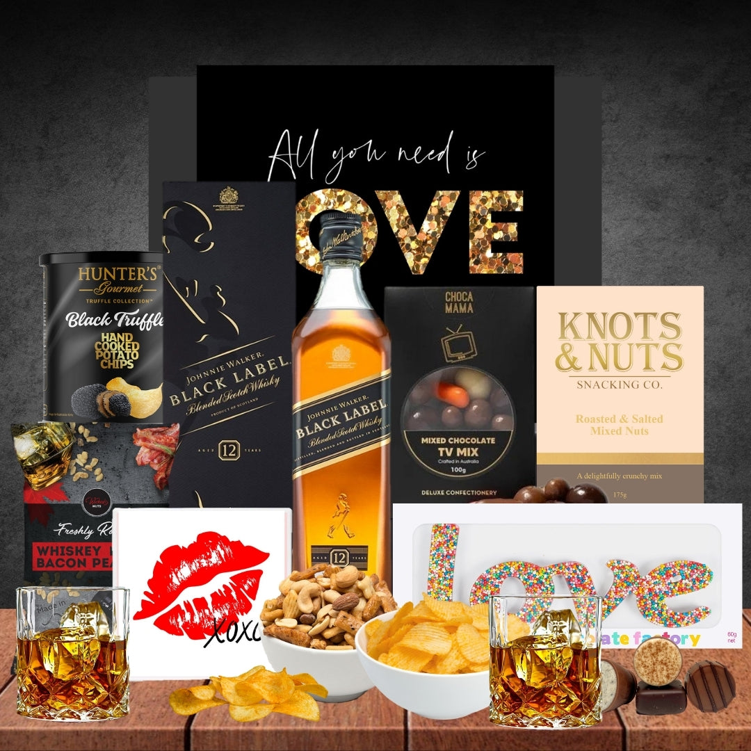A whisky and snacks hamper that makes a great Valentines gift for him or her. Choose their favourite whisky from a selection including Australia's award winning Starward, Chivas Regal, Johnnie Walker Black, Jameson, Dimple, or Jim Beams Devil's Cut. It's whiskey perfection for anyone to enjoy.