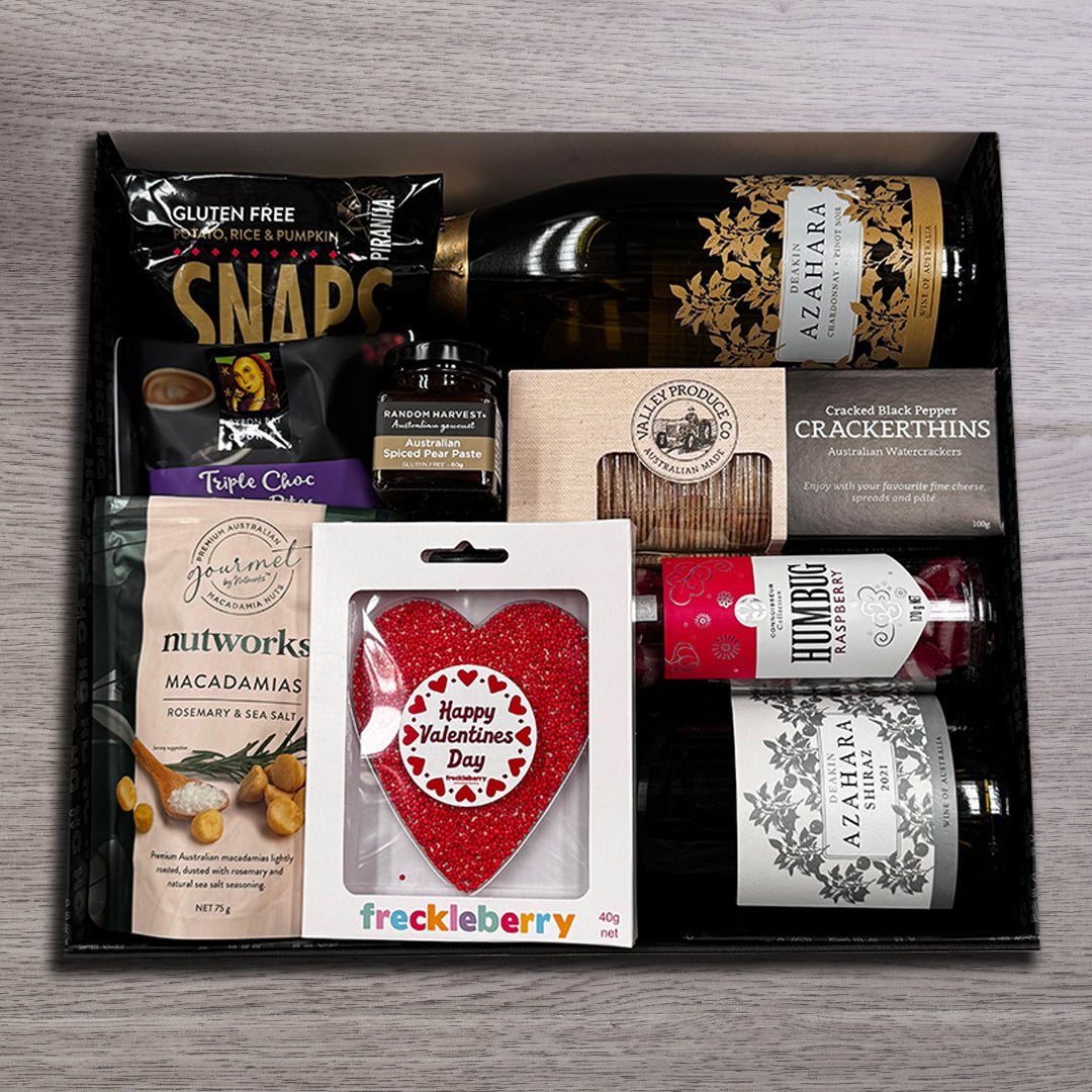 Valentine's Day Perfection! This loved-up gift includes native macadamias, iconic cookies, and two wines! Perfect for a romantic night in or take it on a loving picnic.