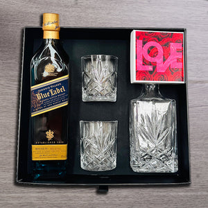 A deluxe whisky and decanter gift set, presented in a stunning gift box. This wonderful gift hamper with the Master of Whiskies, Johnnie Walker Blue Label makes an exquisite Christmas gift, Birthday present, Anniversary or Valentine's gift of love, or a perfect thank you gift for the whisky lover.