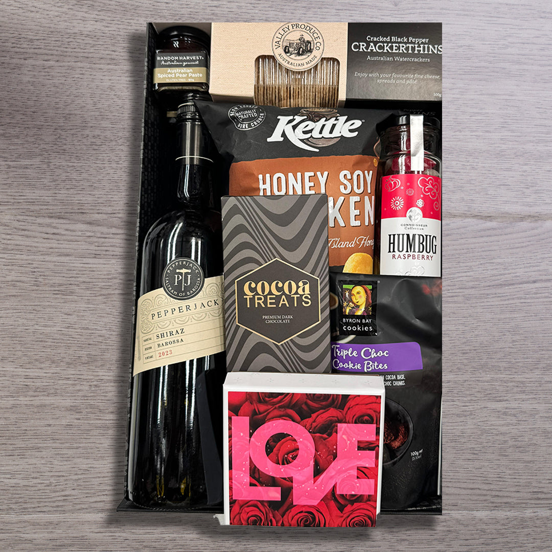 It's Valentines! Send your well wishes to those you care about with this delicious hamper featuring Pepperjack Shiraz and Chocolates. Delightful!
