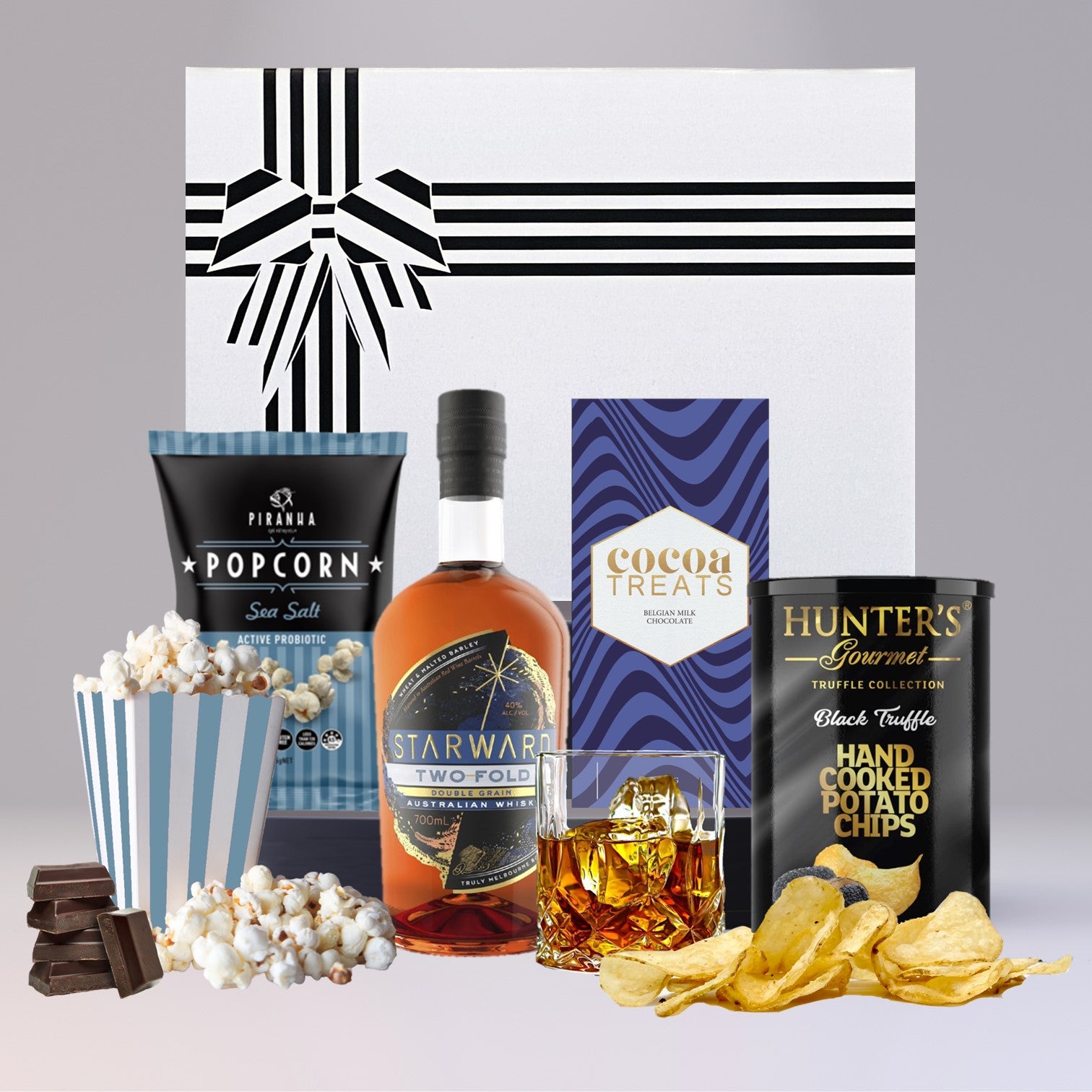 Australian Multi Award Winning Starward Whisky! This gift is a Melbourn whisky loving dream come true. Featuring home-grown Starward Two-Fold whisky, truffle chips, and creamy chocolate, this is a Melburnian's ideal gift.