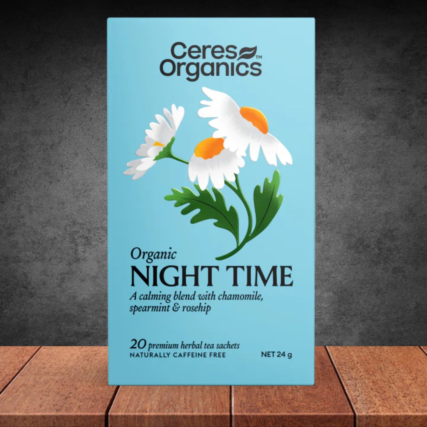 Our Night Time herbal tea's calming formulation prepares you for the onset of some well-deserved rest and can provide a relaxing moment of pause when sipped in the midst of a busy day. Chamomile teams up with spearmint, rosehip, lemongrass, lime flower, passionflower, nettle, and rose bud.