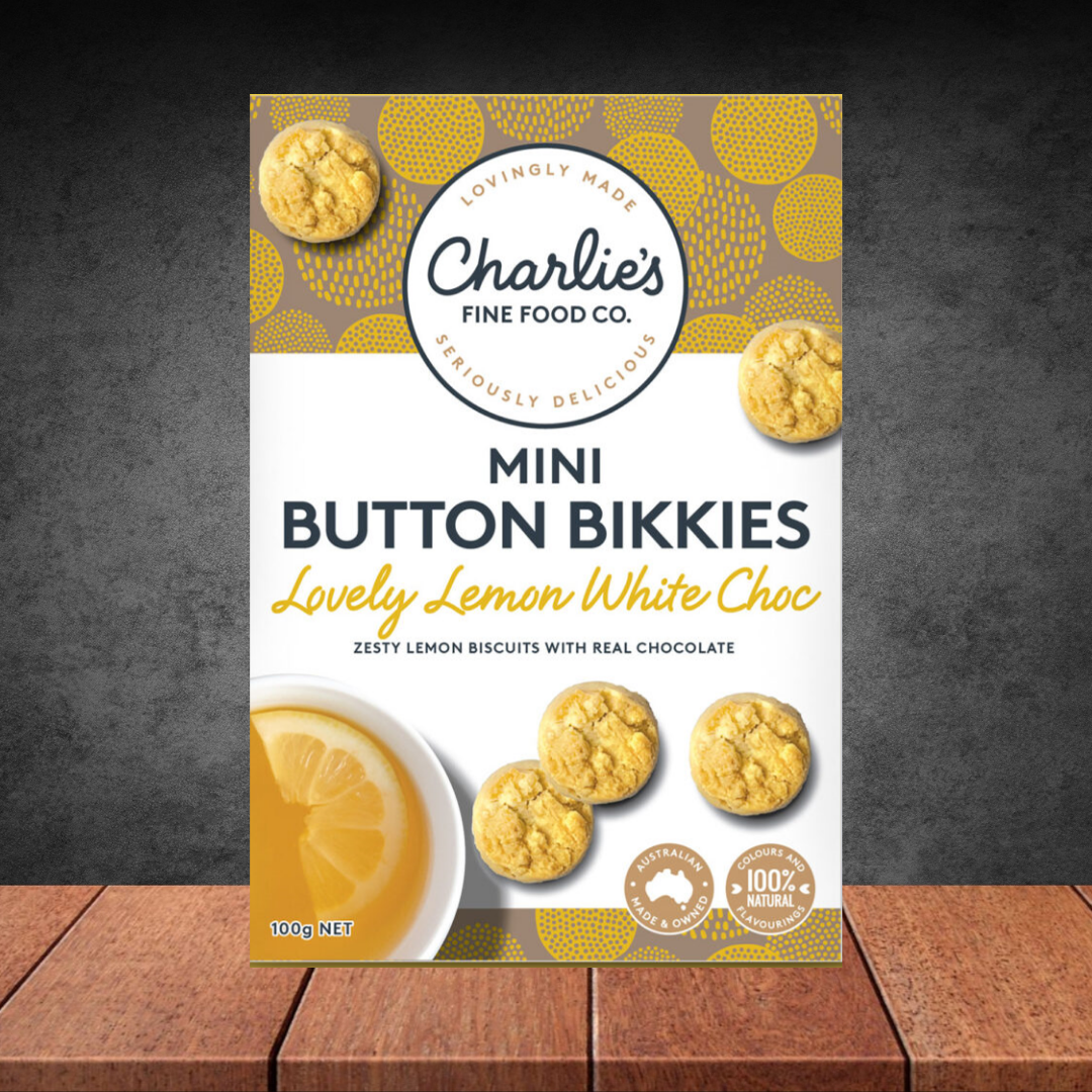 Charlie's Fine Food Co. Lovely Lemon White Choc Mini Button Bikkies 100g