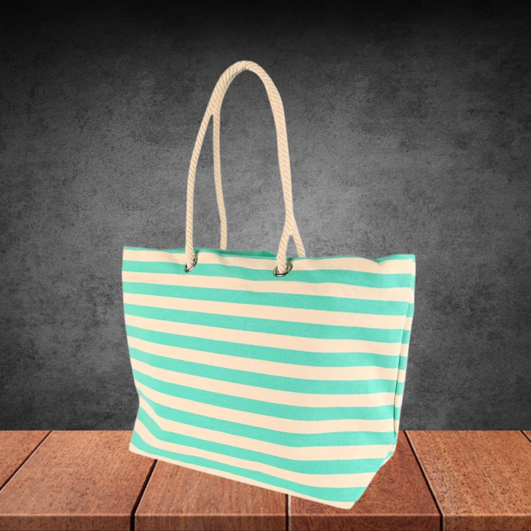 Large Striped Canvas Tote Beach Bag Green- 55cm x 36cm