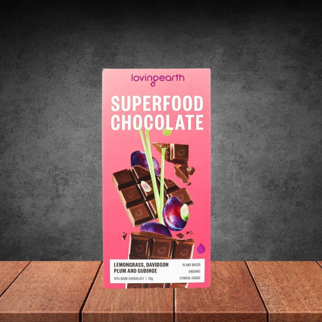 Loving Earth Superfood Chocolate 70g Lemongrass, Davidson Plum, Gubinge. A fun dark chocolate bar with the added benefits of Superfoods.