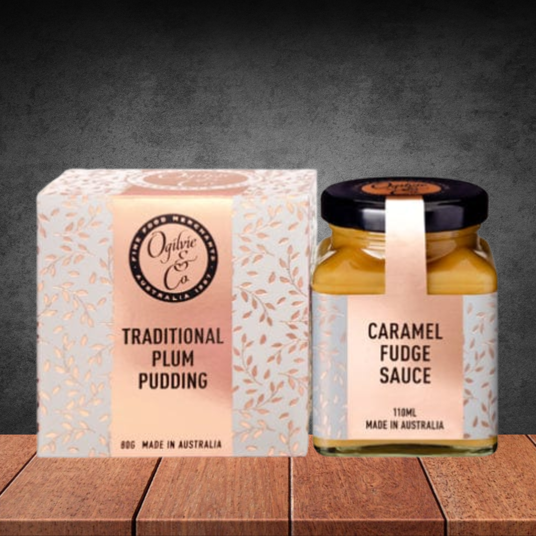 A convenient, beautifully presented gift pack containing our Traditional Plum Pudding 80g Individual Pudding, complete with our smooth Caramel Fudge Sauce 110ml to serve alongside.