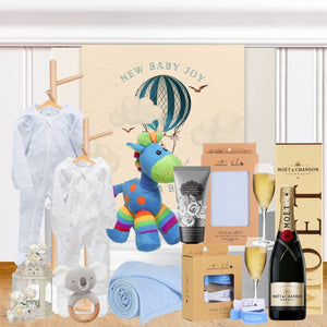 A celebratory gift for the new baby and parents. Welcome the arrival of the little bundle of joy with our Cheers Baby range of wonderful baby hampers. Our inclusive new baby gift features a bottle of Chandon Sparkling, soft rattle, 2 soft baby rompers, a cute baby wrap and more. It's time to toast the new family!